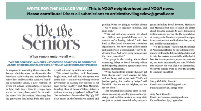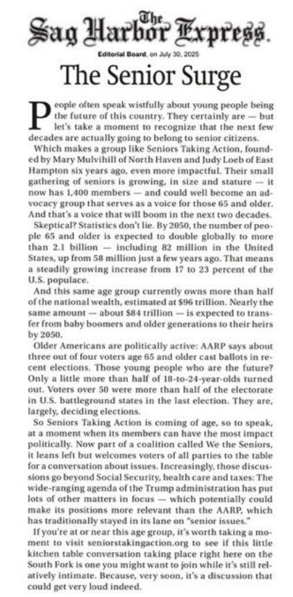 We the Seniors does not have website yet, but that hasn’t stopped people from writing to its email, wetheseniorsusa@gmail.com. “We have been inundated,” said Mulvihill. “Judy and I don’t have any free time.”